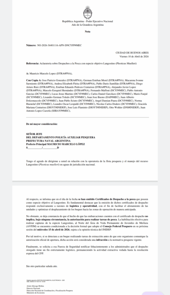 El documento, fechado el 10 de abril de 2026 en la Ciudad de Buenos Aires y registrado bajo el número NO-2026-36401116-APN-DNCYFP#MEC, lleva la firma del director nacional Arturo Idayaga Molina y fue remitido al jefe del Departamento de Policía Auxiliar Pesquera de la Prefectura Naval Argentina, prefecto principal Mauricio Marcelo López.