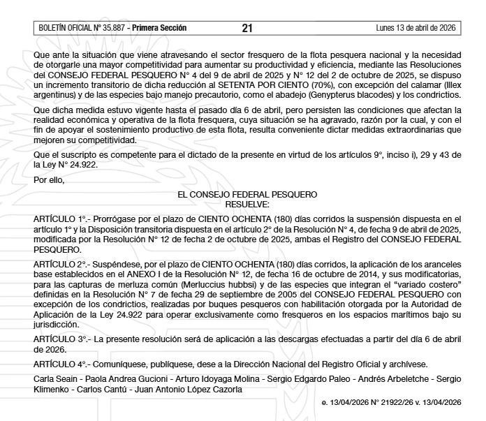 En sus fundamentos, el organismo reconoció que la flota fresquera continúa atravesando dificultades tanto económicas como operativas, agravadas en los últimos meses. En ese contexto, sostuvo que la prórroga constituye una herramienta clave para mejorar la competitividad del sector y preservar el nivel de actividad.
